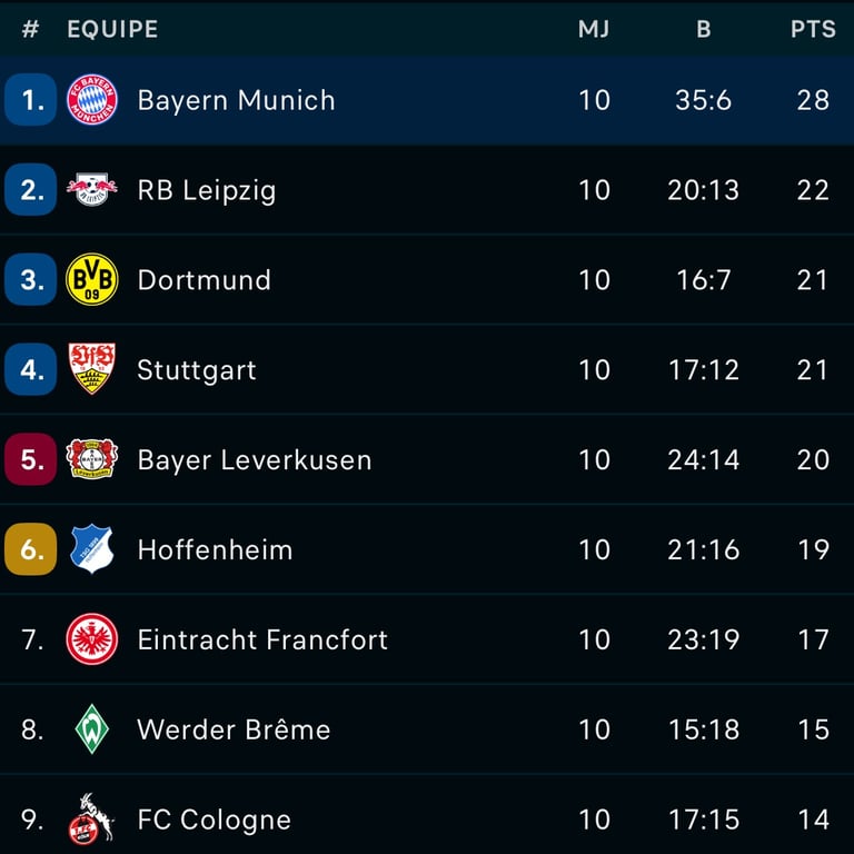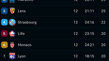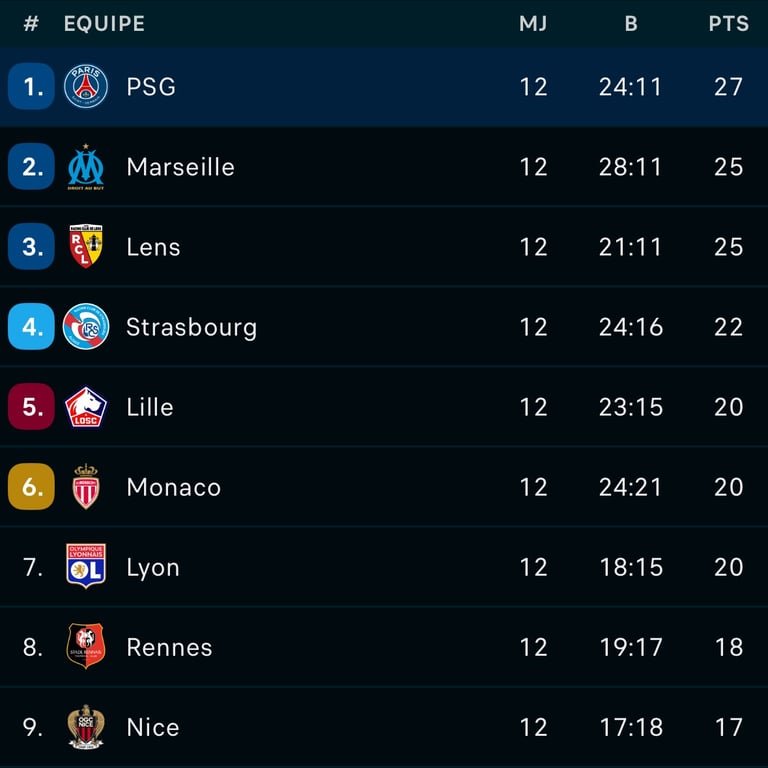 Au 15 novembre 2025, après 12 journées de Ligue 1 2025-2026, le Paris Saint-Germain domine le classement avec 27 points, invaincu en grande partie grâce à une défense solide et des attaques efficaces. L'Olympique de Marseille suit de près avec 25 points, boosté par une série de victoires impressionnantes comme le 3-0 contre Brest. Le RC Lens surprend en troisième place avec 25 points également, confirmant son statut de prétendant au podium