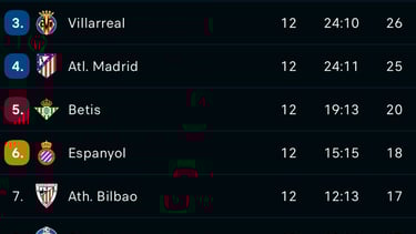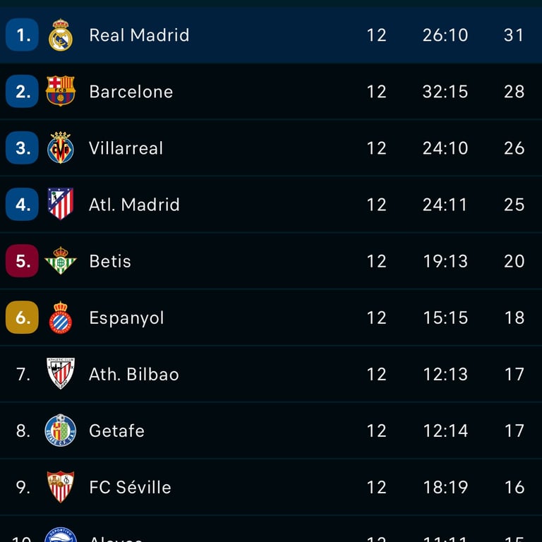 Au 15 novembre 2025, après 12 journées de la Liga espagnole 2025-2026, le Real Madrid trône en tête avec 31 points, fort d'une série impressionnante incluant une victoire 3-1 contre le Villarreal récemment. Le FC Barcelone suit à 28 points, avec une attaque prolifique (32 buts marqués) et une seule défaite, confirmant son retour en force sous Xavi. Villarreal (26 points) et l'Atlético Madrid (25 points) complètent le podium, tandis que le Betis (20 points) surprend à la cinquième place.