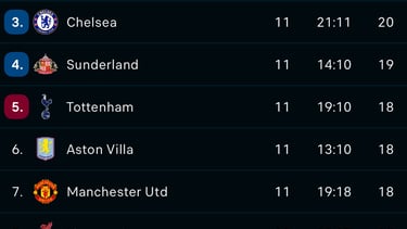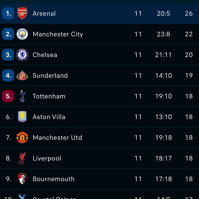 Au 15 novembre 2025, après 11 journées de Premier League 2025-2026, Arsenal domine le classement avec 26 points, grâce à une défense impénétrable (seulement 5 buts encaissés) et une série de victoires solides. Manchester City suit à 22 points, avec une attaque explosive menée par Haaland (23 buts marqués), malgré une défaite récente contre Liverpool. Chelsea (20 points) et Sunderland (19 points, promu surprise) complètent le top 4, illustrant une saison compétitive.